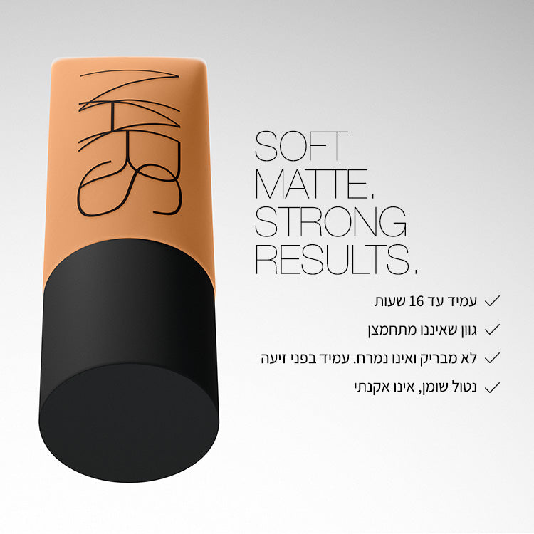 גלי סיפוק לאורך כל היום עם מייק-אפ מאט פורץ דרך: גוון צבע הנשאר ועמיד בפני התחמצנות. כיסוי מלא שנראה טבעי לחלוטין. נוחות למשך 16 שעות. מכיל תרכובת נוגדת חמצון בלעדית של NARS אשר מונעת מהגוון להתחמצן ומגנה עליו מפני נזקי הסביבה ואור כחול. תרכובת ייחודית מאזנת את יצור עודפי השומן בזמן שהיא מעניקה הזנה משולבת אצות וחומצה הילרואנית. פודרות שנבחרו בקפידה סופחות שומן ויוצרות עור חלק ומאוזן. מספק. המאט החדש. זמין ב-34 גוונים לכל גווני העור. עמיד בפני חמצון. אינו מכתים. מאט מתמשך.