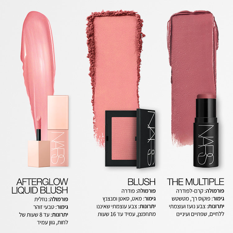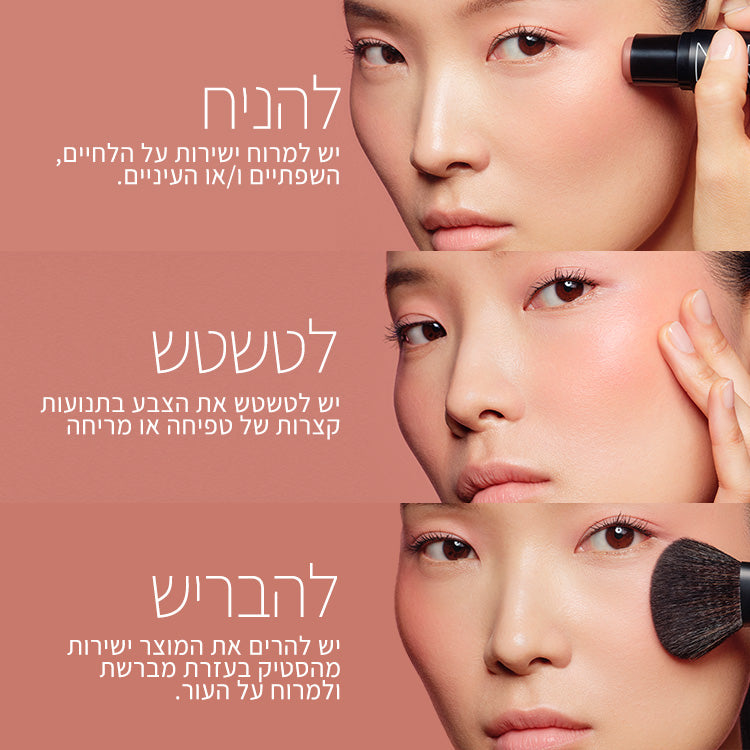 • למראה מונוכרומטי, הניחי על הלחיים, שפתיים ועיניים. לחלופין, ניתן למרוח על אזור אחד לקבלת צבע ממוקד.